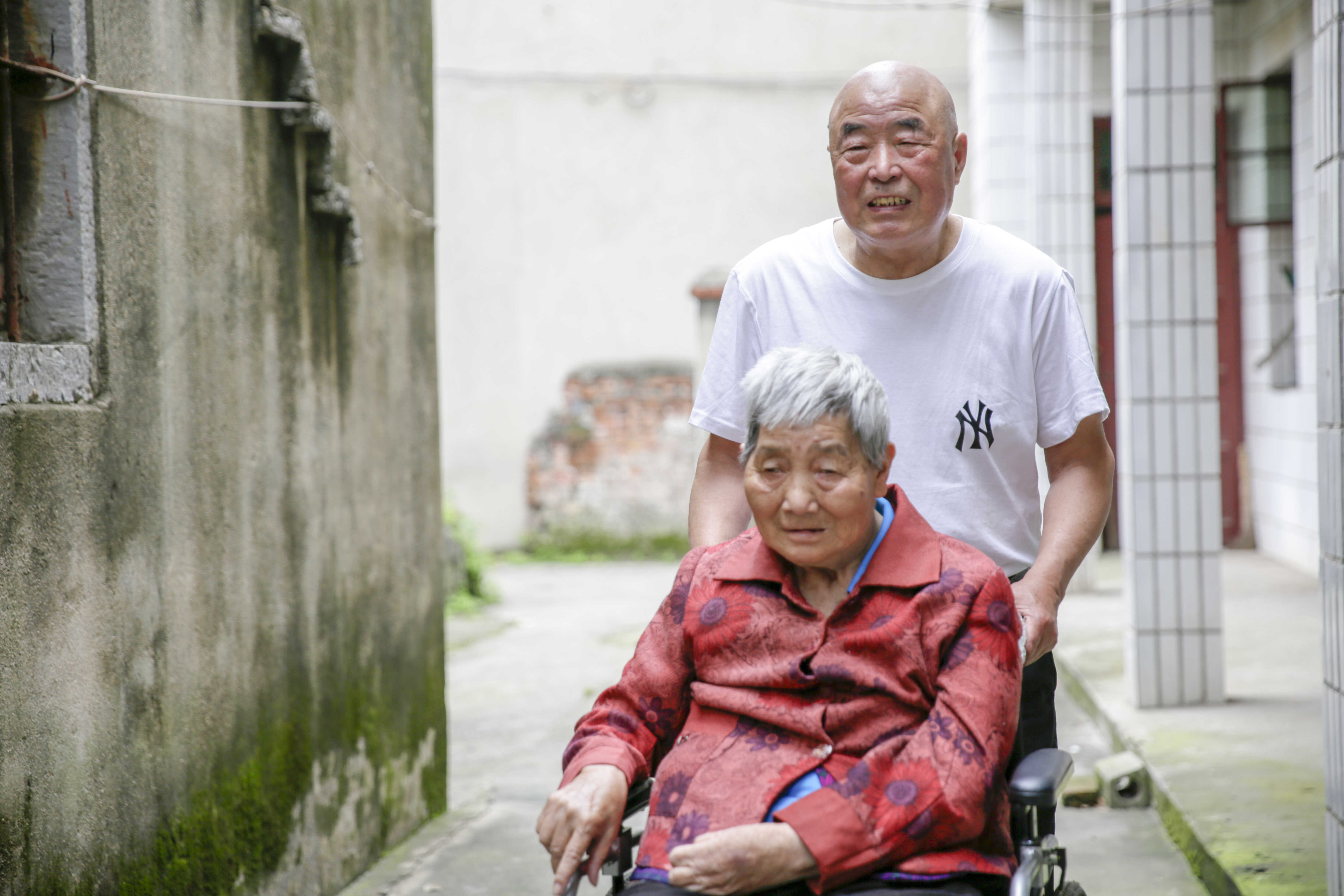 2010年3月的一天,黃相英坐在門口跟別人聊天,準(zhǔn)備起身回家做午飯時,突然倒在地上。送到醫(yī)院診斷,結(jié)果是血管破裂引起的腦溢血,出院后,黃相英半身癱瘓,只有一邊手腳能動,但沒有力氣,一吃飯就撒一身。于是,每次吃飯,汪賢商就像喂小孩一樣喂飯。老伴喜歡吃稀飯、面條等好消化的食物,他就變著花樣給她做。在他的精心照顧下,黃相英的身體一天天恢復(fù)了,精神狀態(tài)也不錯。汪賢商深知妻子喜歡出門活動,唯恐她在家憋悶不開心,只要不下大雨或下雪,汪賢商堅持推著輪椅帶老伴黃相英出門,擔(dān)心老伴長期不鍛煉,手腳會萎縮,汪賢商想了個“土辦法”,每天都用繩子套在老伴的腳上,一只手抱著她前行,另一只手拉動繩子幫她移動鍛煉。汪賢商說,這些年下來,繩子和皮帶都用斷了十幾根,輪椅也用壞了十幾輛。