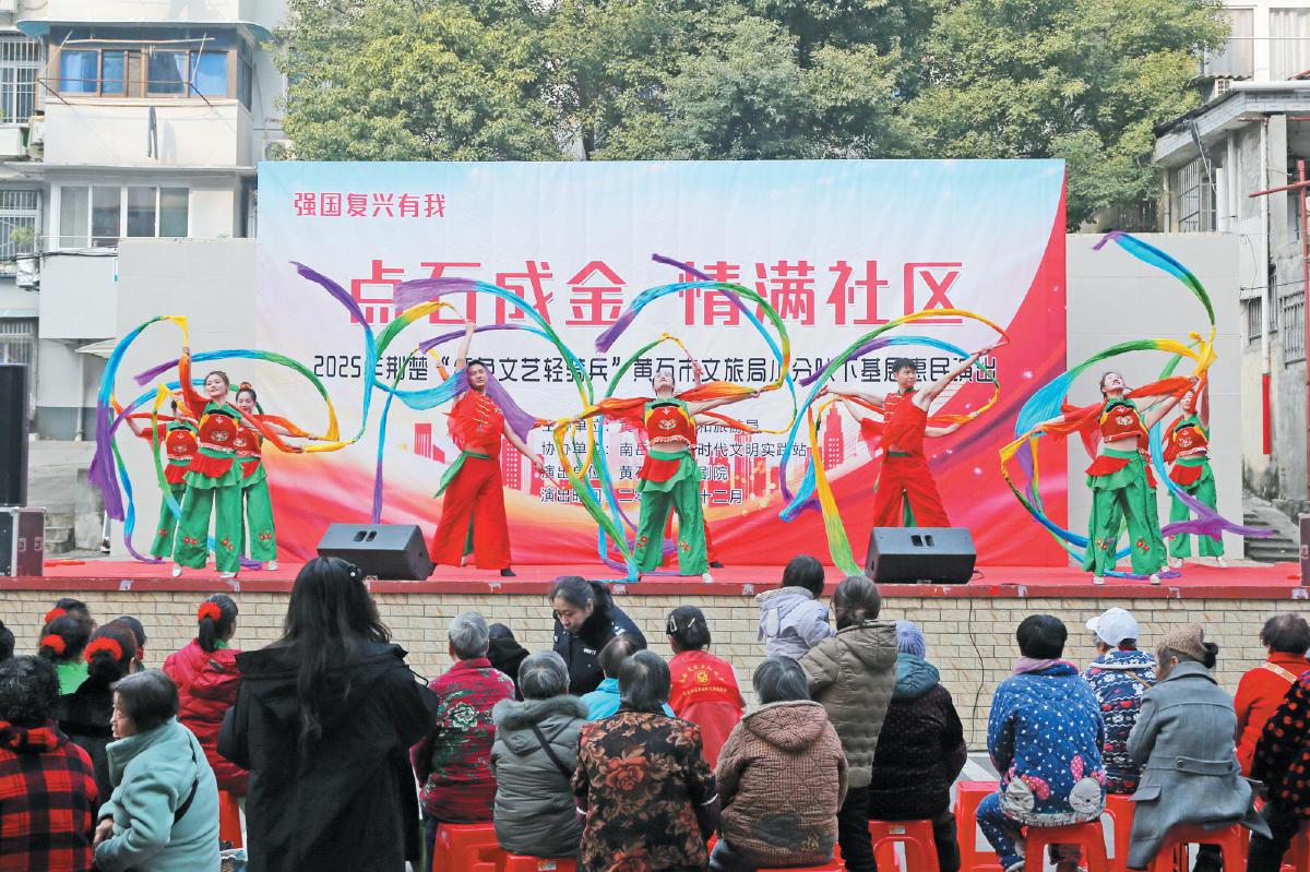 12月18日,由市文旅局主辦的“點(diǎn)石成金 情滿社區(qū)”2025荊楚“紅色文藝輕騎兵”黃石市文旅局小分隊(duì)下基層惠民演出在黃石港區(qū)南岳社區(qū)舉行,市歌舞劇院的演員們用精彩的歌舞表演,為廣大居民奉上豐盛的文化大餐。
