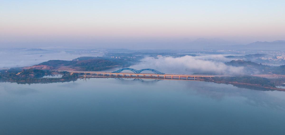 1月6日早上,陽新縣武陽高速連接線——民福路段云霧繚繞。獨山湖大橋橫臥在湖面上,與遠山近水相映成趣,宛若一幅渾然天成的畫卷。通訊員 嚴(yán)建 攝
