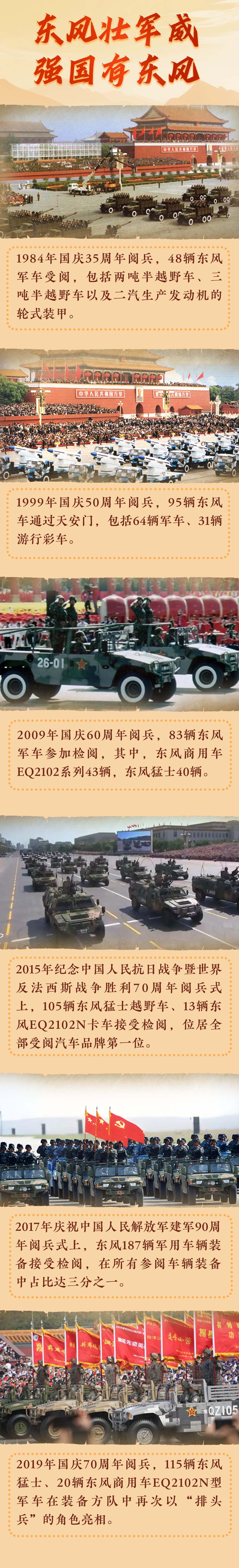 東風(fēng)因軍而建、因軍而興、因軍而榮,這支從鄂西北山溝中走出的“鋼鐵長城”,用超越半個(gè)世紀(jì)的堅(jiān)守,鑄就了中國軍車第一品牌的傳奇?;仡櫄v史,東風(fēng)汽車已經(jīng)6次光榮接受黨和人民檢閱,其中在2009年,走過一個(gè)甲子年的共和國迎來60華誕,40輛東風(fēng)“猛士”首次作為引導(dǎo)車出現(xiàn)在了閱兵大典中。