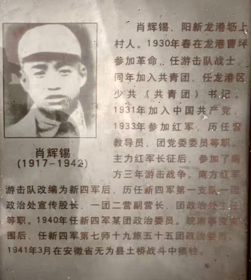 這樣的場景幾乎每天都在上演,村里人都知道,老村長又在思念他那位從未謀面的父親——抗日烈士肖輝錫(亦作“蕭輝錫”)。1947年出生的肖漢江,是肖輝錫過繼的兒子?!澳銧敔斒强谷沼⑿?,立下過赫赫戰(zhàn)功。當(dāng)年的事跡,你們都要記牢。”肖漢江對兒子肖唐傳說話時,聲音不自覺地沉了幾分。