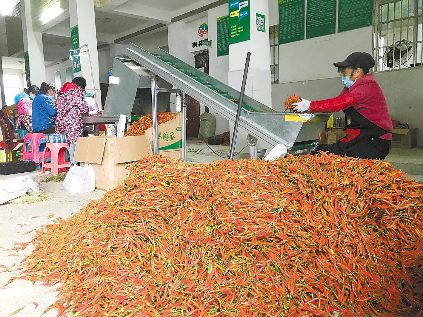 走進(jìn)村農(nóng)產(chǎn)品加工園區(qū),車間堆滿火紅的朝天椒,幾名婦女站在機(jī)器傳送帶兩側(cè),手指如蜻蜓點(diǎn)水般嫻熟地分揀,優(yōu)質(zhì)椒裝袋外銷,品相稍差的進(jìn)入清洗池準(zhǔn)備制成辣椒醬。